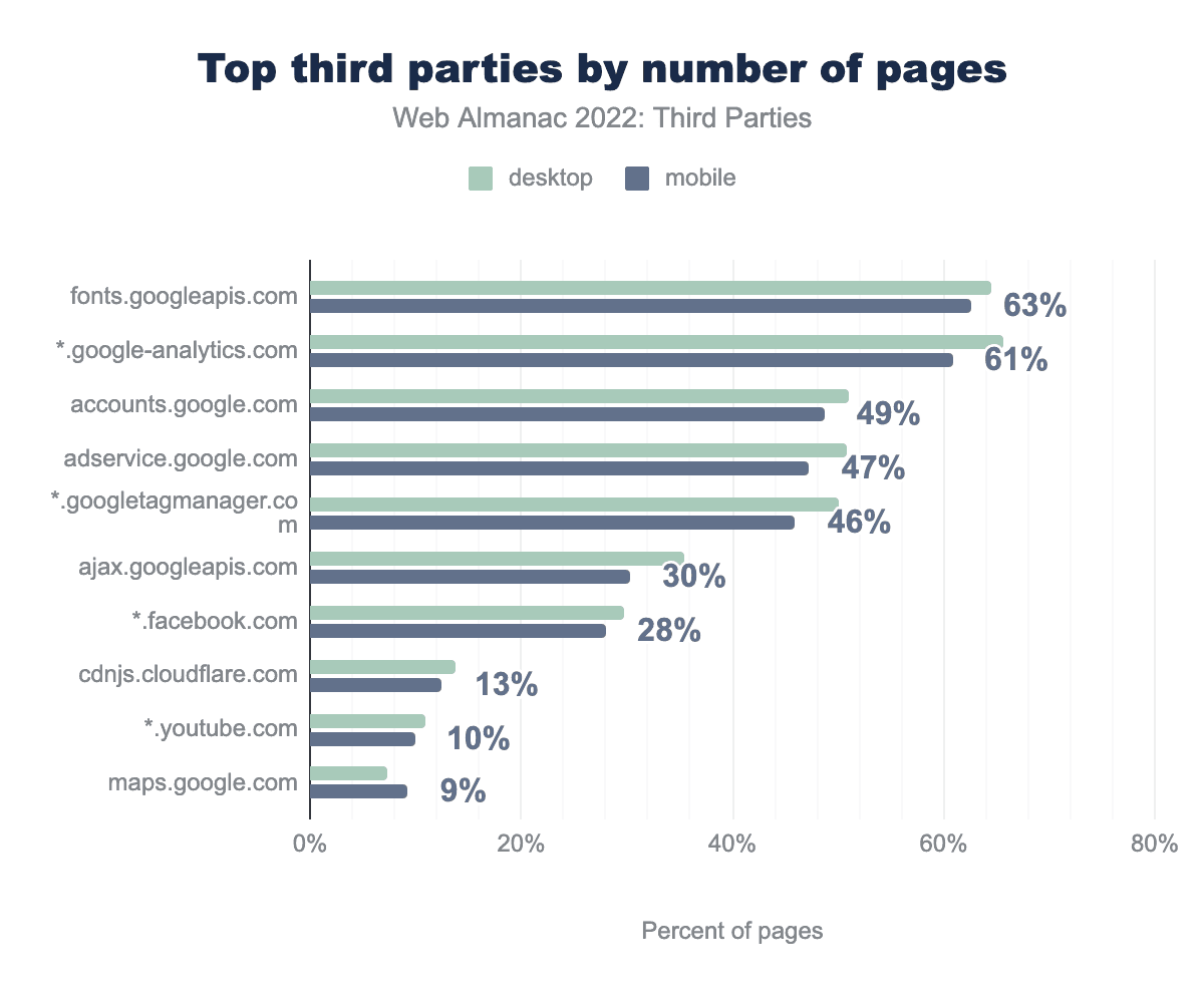 Google services: fonts, analytics, account management, advertising, and tag management, are the most popular third parties across the entire web. 63% of all pages use Google Fonts which is over 4.9 million pages out of the 7.9 million mobile pages in our dataset!