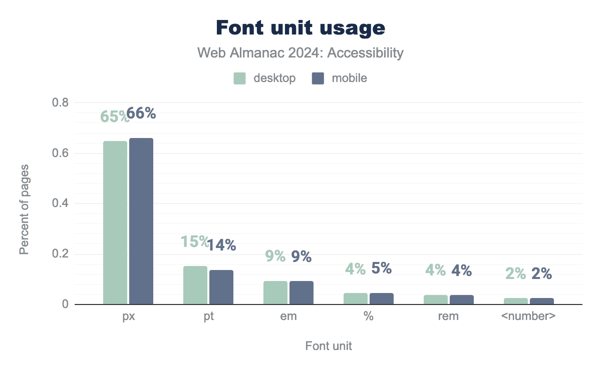 How font sizes are defined also affects the readability, as pixels are not as flexible as other units. Pixel (px) use is 65% in desktop and 66% in mobile. The use of em has increased to 9% from 6% in 2022. rem was at 6% in 2022, and has reduced to 4% now. There is not a significant increase in the use of em or rem since 2022, even though it often gives the user a better experience when they increase or decrease their font size in their browser settings.