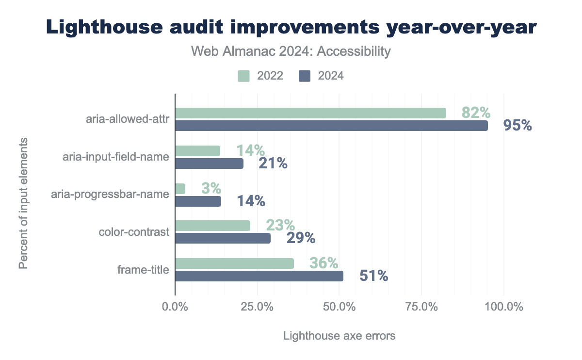 Google Lighthouse now contains 57 different audit tests which they use for their scoring. These are all based on Deque’s open source axe-core, which is widely adopted in a range of accessibility products and services. With the exception of 7 audits (aria-meter-name, aria-toggle-field-name, aria-tooltip-name, document-title, duplicate-id-active, html-lang-valid, and object-alt) there have been improvements across the board. Both object-alt and aria-tooltip-name were called out for their improvements in 2022, but sadly this improvement was not repeated in 2024.