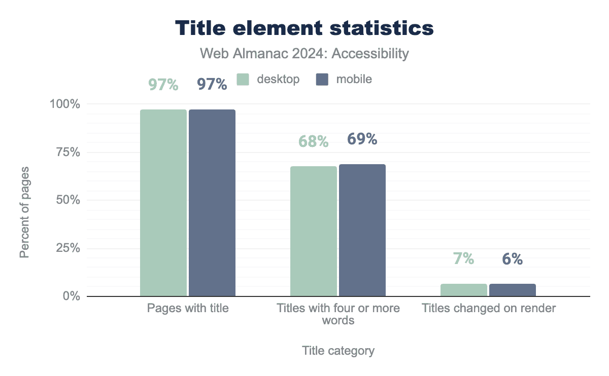 It’s promising to note that in 2022, 83% of mobile websites included a lang attribute, and two years later it is at 86%. However, since this is a Level A conformance issue under WCAG, there is still room for improvement. To meet this criterion, the lang attribute should be added to the <html> tag with a recognized primary language tag. Properly defining the language is crucial. Sometimes, when a template is copied to create a new website, discrepancies can arise between the language of the content and the language attribute (lang=”en”) in the code.