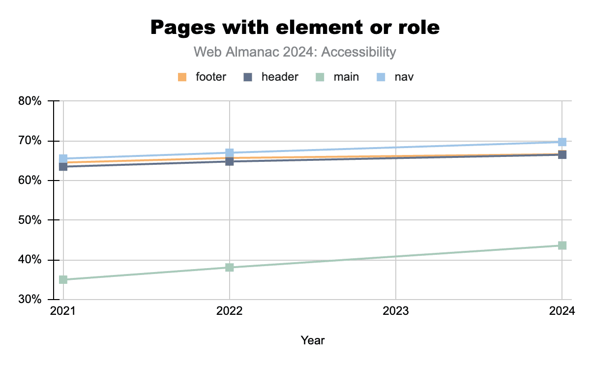The most commonly expected landmarks for most web pages include <main>, <header>, <nav>, and <footer>. Our findings reveal that:
