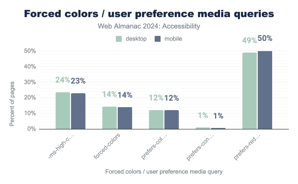 We discovered that over 50% of mobile sites include the prefers-reduced-motion media query, up from 34% in 2022. This is important because digital animations can harm individuals with vestibular disorders; using this query allows for adapting or removing such animations to improve accessibility. Mozilla’s Developer community has some good resources on building motion-sensitive sites.