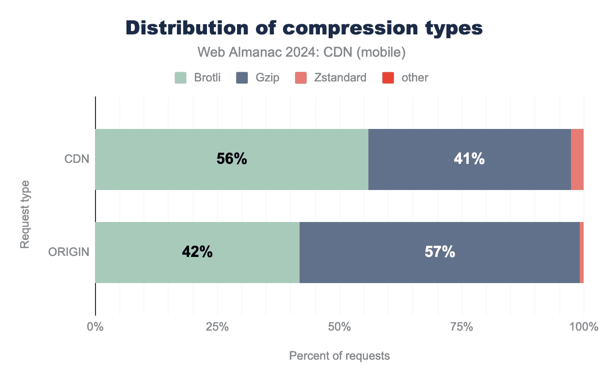 Below is the analysis of compression types used by CDNs and origin servers in the Web Almanac 2024 reveals trends in how web content is optimized for delivery.
