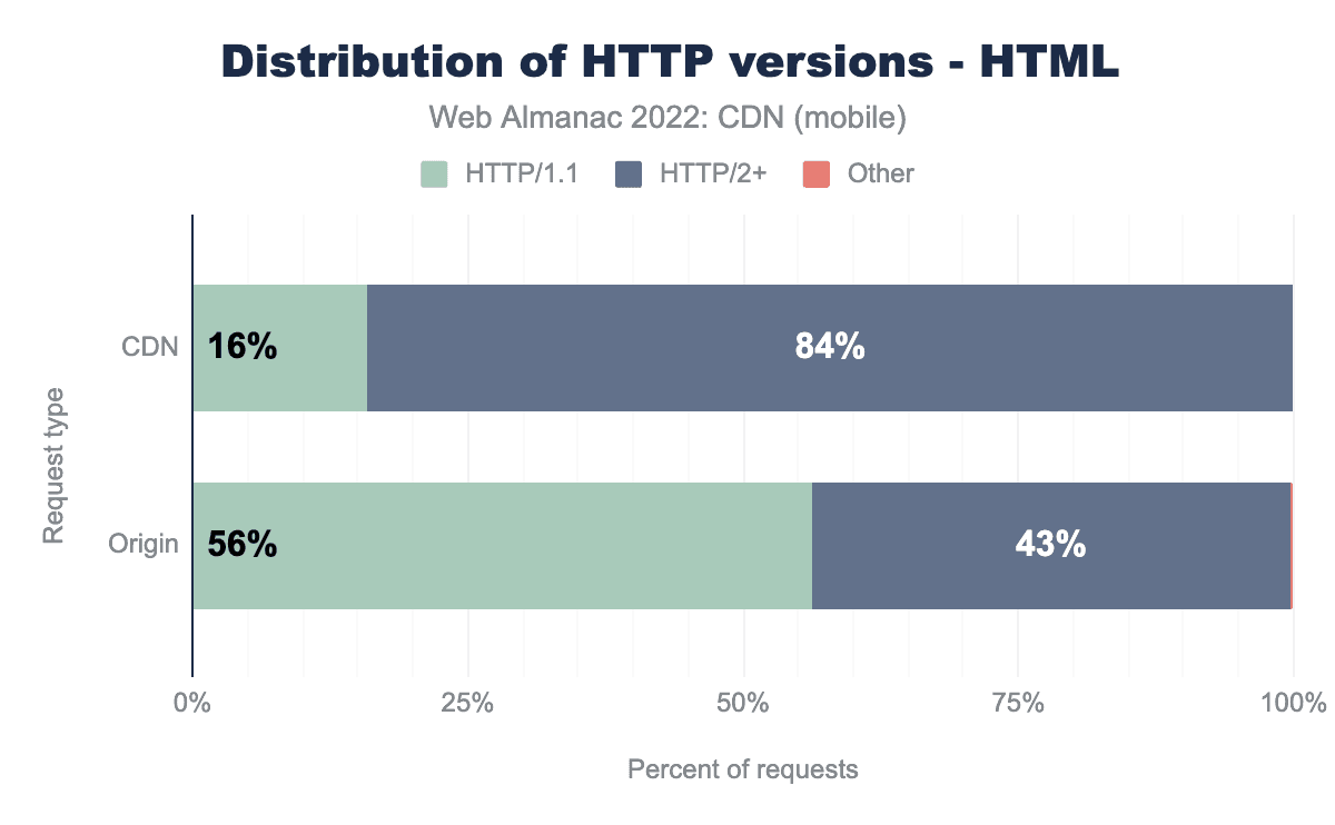 The chart above shows the breakdown of requests for different types of content (HTML, Subdomain, and Third-party), showing the share of content served by CDN versus origin on mobile devices (identical figures are observed for desktop).