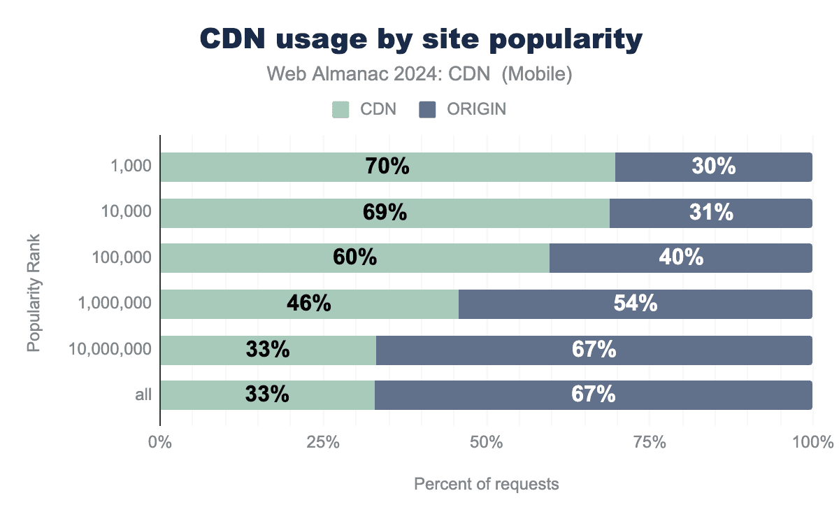 As mentioned in previous editions, the increase in CDN usage among smaller sites can be attributed to the rise of free and affordable CDN options. Additionally, many hosting solutions now bundle CDNs with their services, making it easier and more cost-effective for websites to leverage this technology.