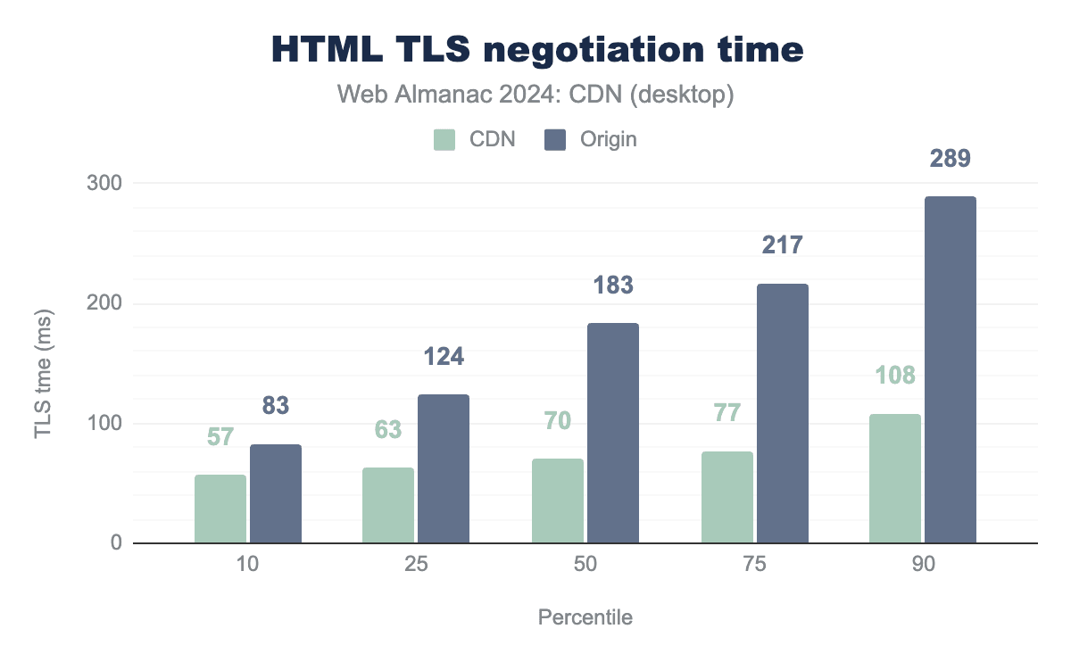 TLS negotiation times reveal significant differences between CDN and Origin servers, as well as between desktop and mobile devices.