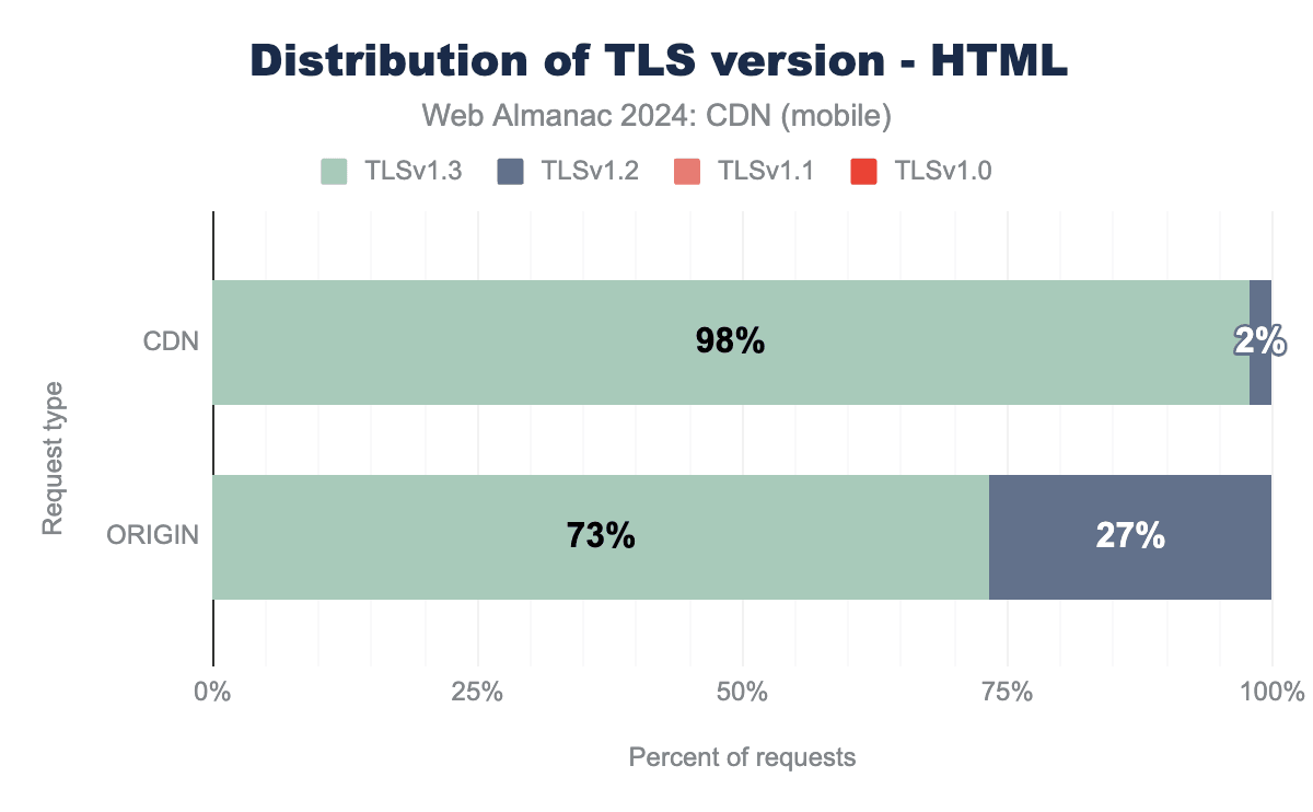 CDNs have embraced TLS 1.3, with 98% of requests using this latest version. This is great for developers because TLS 1.3 is faster at establishing secure connections, which means websites load more quickly. CDNs are at the forefront of adopting new technologies to optimize content delivery and security and by fronting your application with a CDN, you automatically reap those benefits with minimal efforts.
