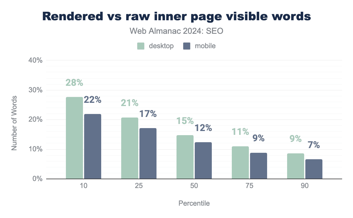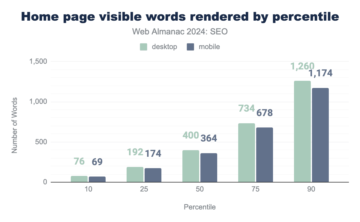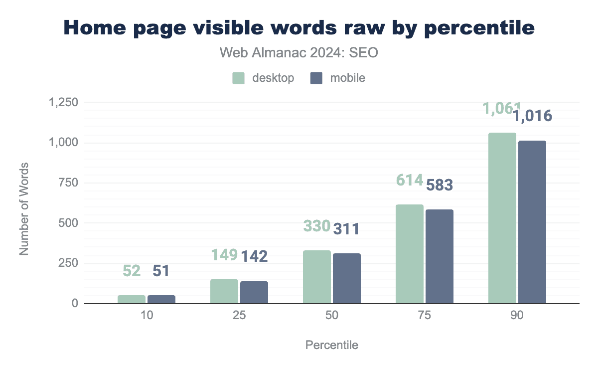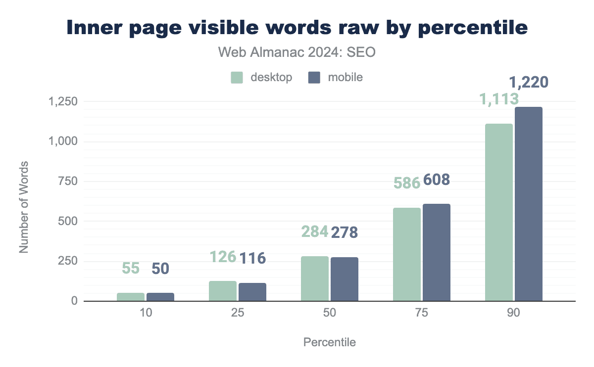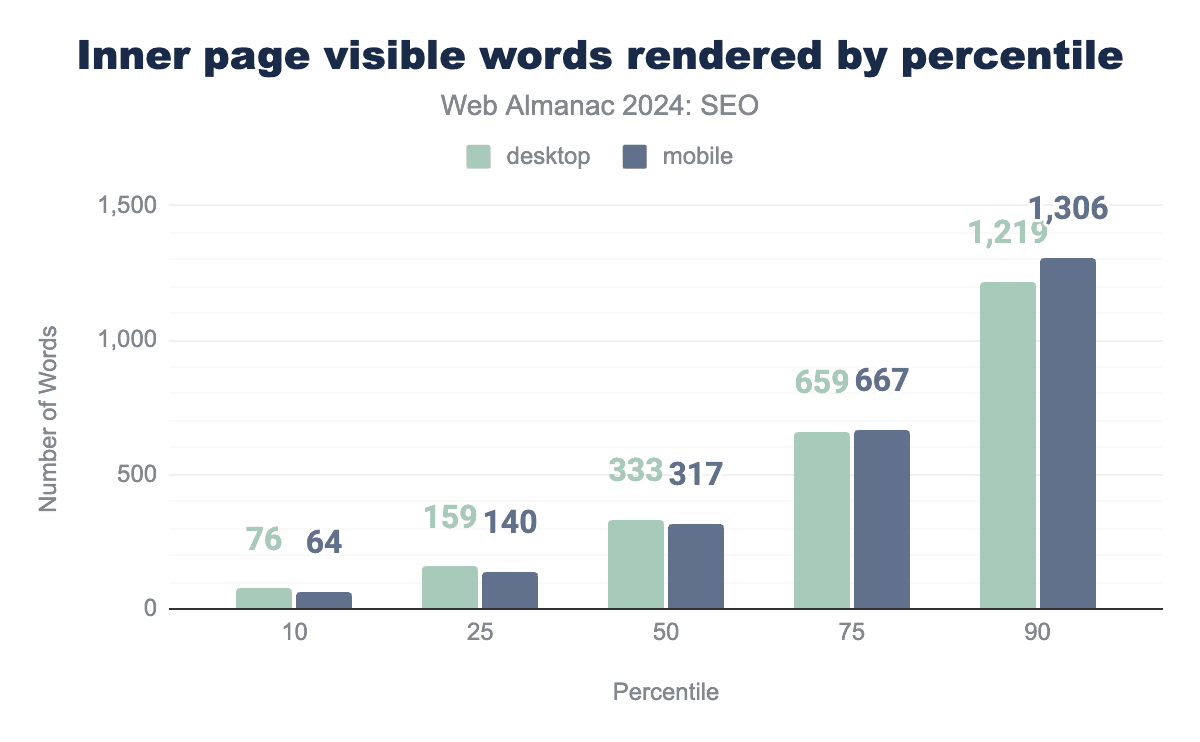 Inner pages contain slightly fewer words overall. The median mobile inner page in 2024 had 317 visible words after rendering, while desktop inner pages had 333 words.