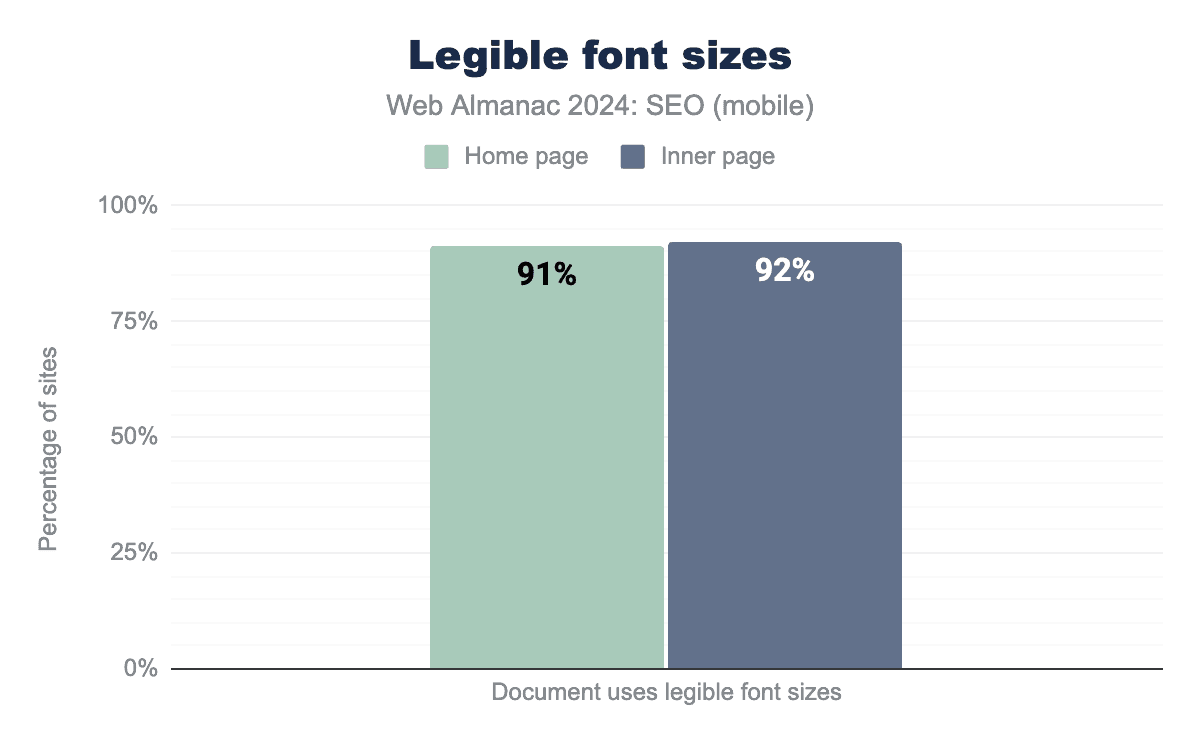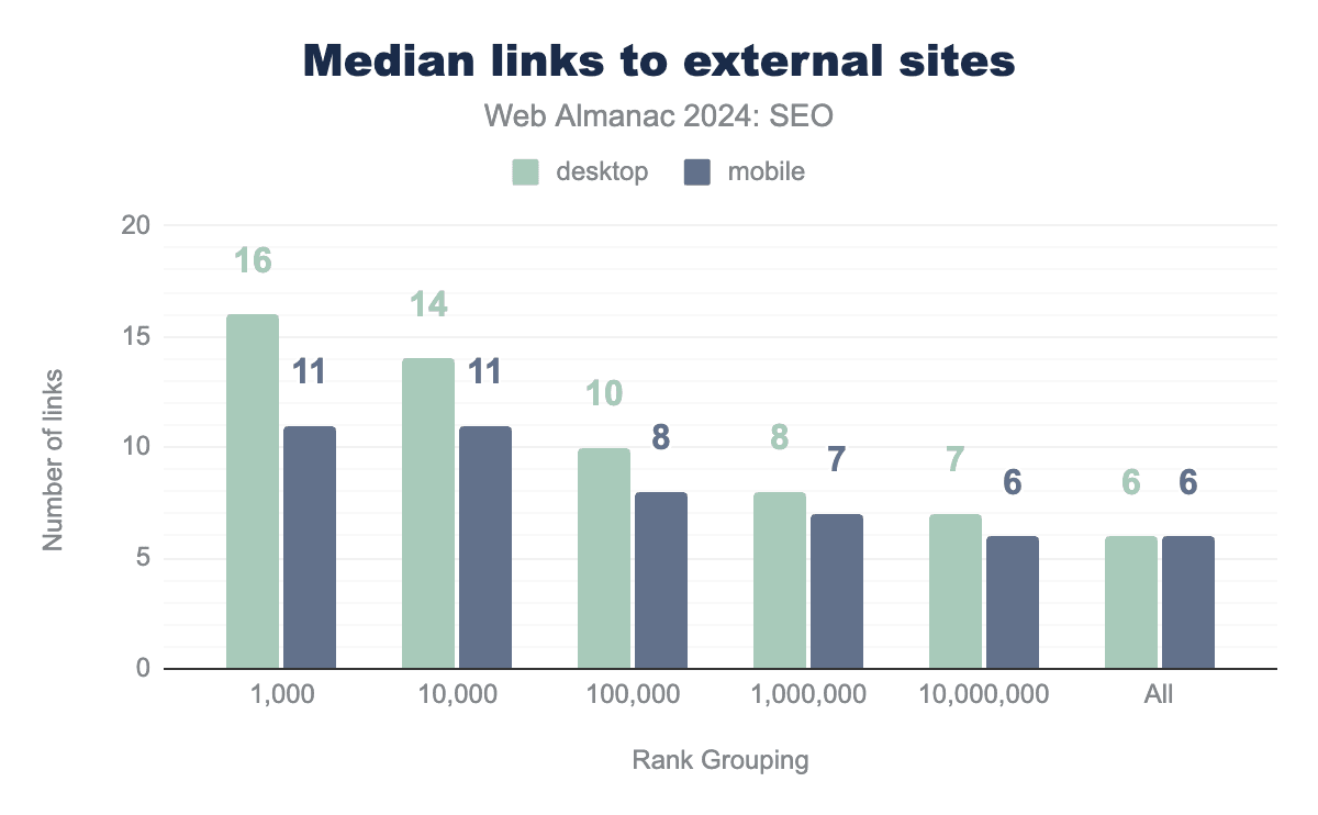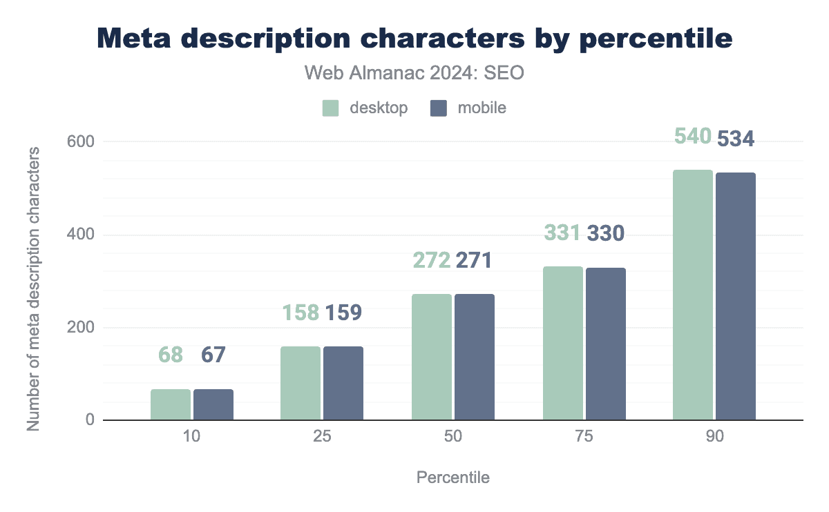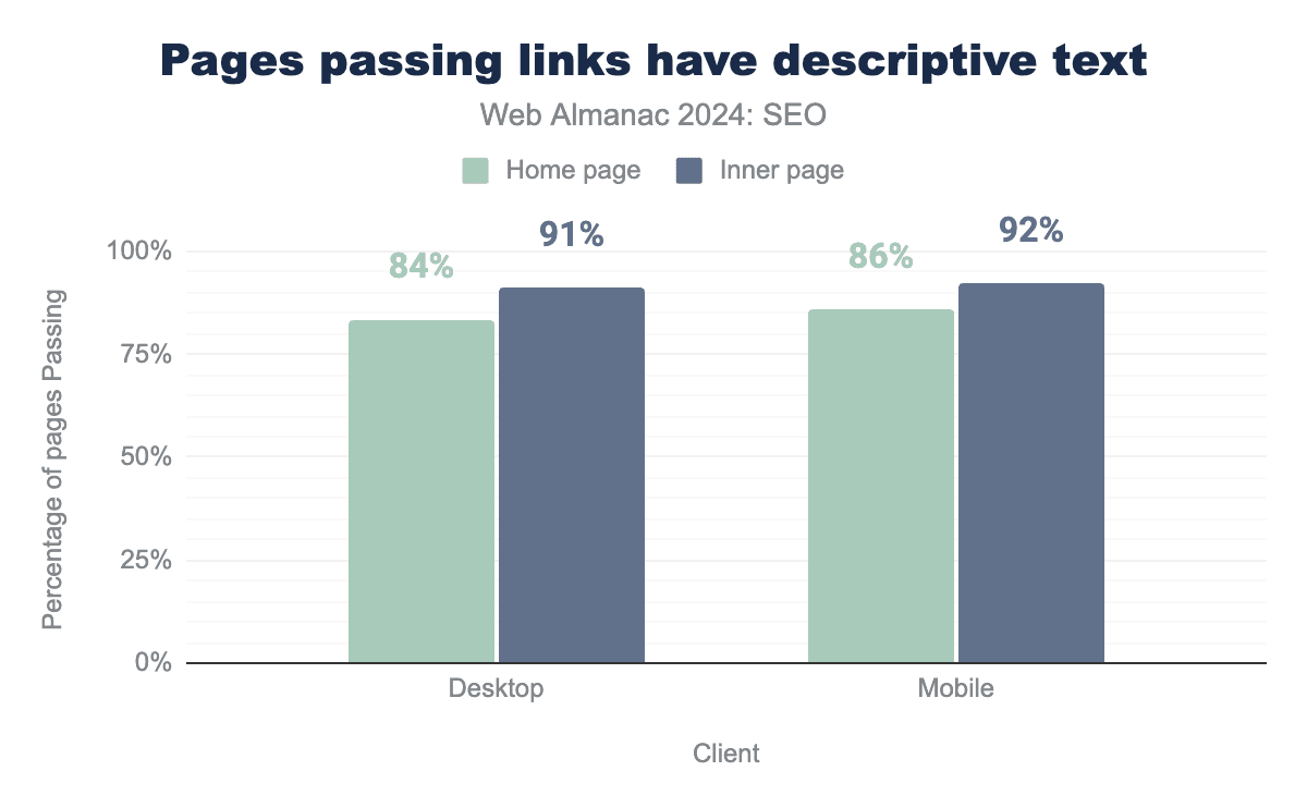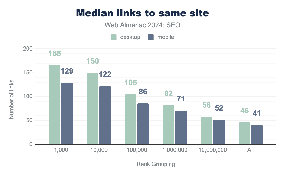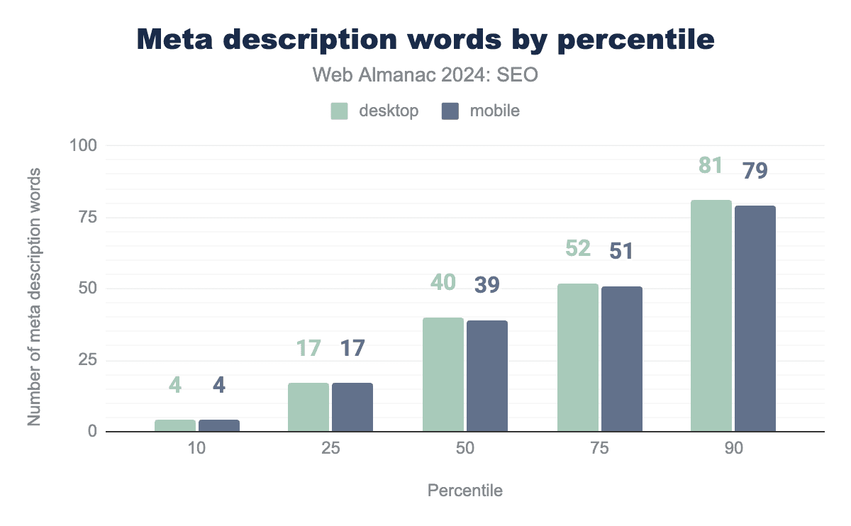 Inner pages contain slightly fewer words overall. The median mobile inner page in 2024 had 317 visible words after rendering, while desktop inner pages had 333 words.