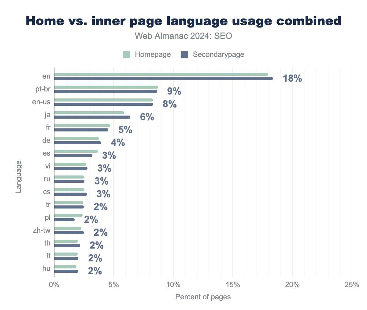 As for distribution, the use of hreflang tags on inner pages is similar to that found on home pages. The x-default and en lead in adoption in both categories and underscores their global reach. Their percentages are lower on inner pages, which implies that hreflang implementation is generally prioritized on home pages.