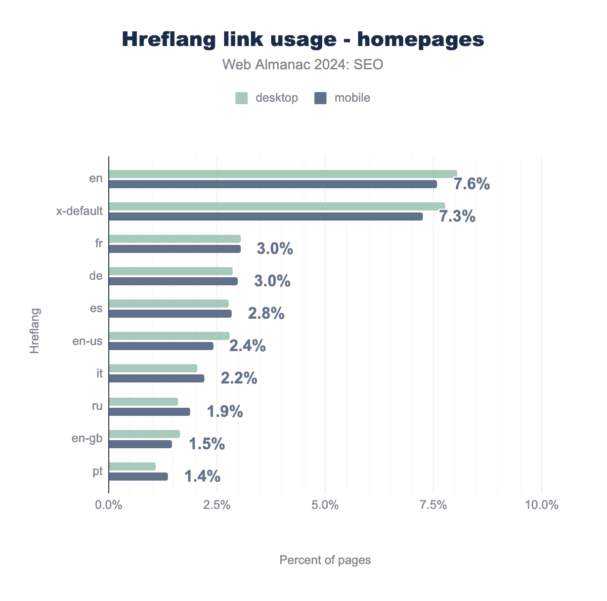 hreflang links on home pages, broken down by language code and platform (desktop vs. mobile). The total values for each tag are: en (7.6%), fr (3.0%), de (3.0%), es (2.8%), en-us (2.4%), it (2.2%), ru (1.9%), en-gb (1.5%), and pt (1.4%).hreflang link usage for home pages.