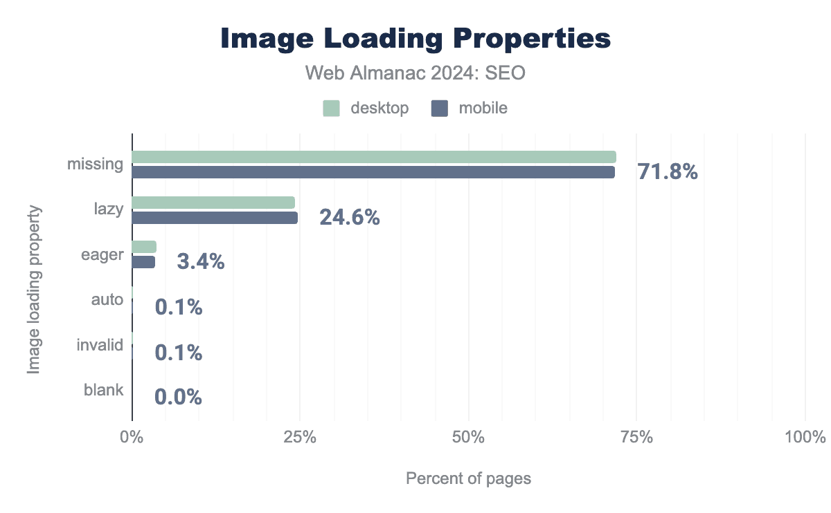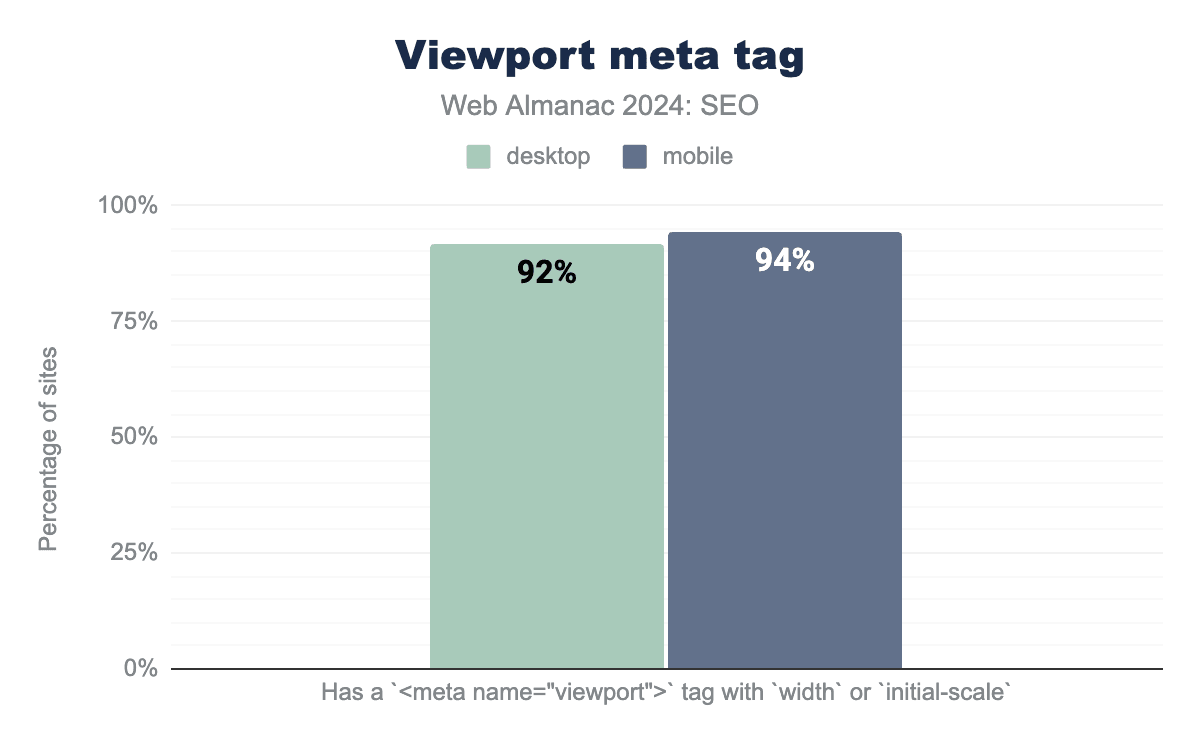 That’s why it’s a little surprising there was a slight uptick in the percentage of pages containing the amp html attribute. In 2024, it went up to 0.27% for mobile crawls compared to 0.19% in 2022. The desktop crawls, however, dropped to just 0.04%, down from 0.07% in 2022.