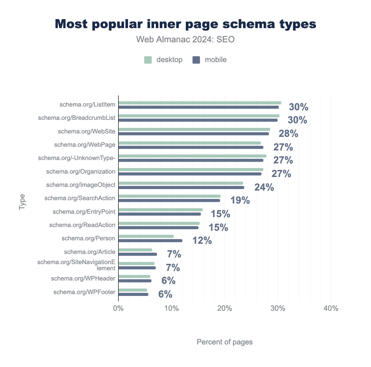 schema.org/ListItem was found on 31%, schema.org/BreadcrumbList on 30%, schema.org/WebSite on 29%, schema.org/WebPage on 27%, schema.org/-UnknownType- on 28%, schema.org/Organization on 27%, schema.org/ImageObject on 24%, schema.org/SearchAction on 19%, schema.org/EntryPoint on 16%, schema.org/ReadAction on 15%, schema.org/Person on 10%, schema.org/Article on 6%, schema.org/SiteNavigationElement on 7%, schema.org/WPHeader on 6%, schema.org/WPFooter on 5%. For mobile, they were found on 30%, 30%, 28%, 27%, 27%, 27%, 24%, 19%, 16%, 15%, 12%, 7%, 7%, 6% and 6% of pages, respectively.In terms of the inner pages, ListItem was the most popular schema type in 2024, representing 30% of mobile and 31% of desktop URLs. It stands to reason there would be more listing pages than “leaf” pages, such as product, event, or article pages (although Article schema was the 12th most popular type).