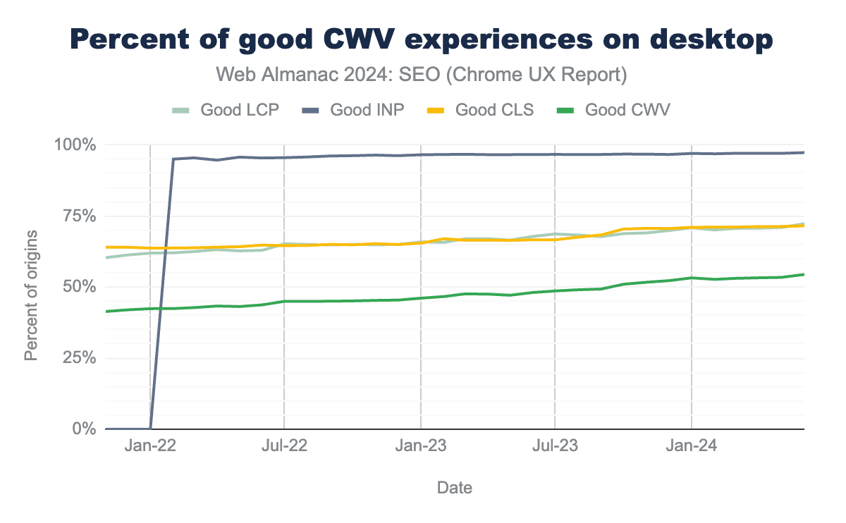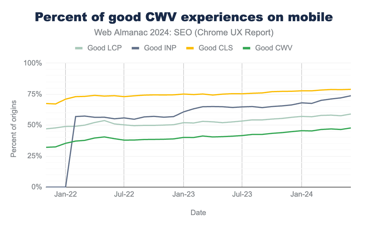 That said, it has not been business-as-usual. The amount of sites passing Core Web Vitals (CWV) has been tremendous, despite Interaction to Next Paint (INP) replacing the arguably much easier to pass metric of First Input Delay (FID). That positive news signals how performance, in general, is being taken more seriously in the SEO industry.