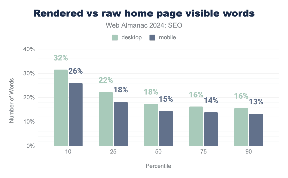 When the rendered visible and raw word counts are compared on home pages, there’s a surprisingly small discrepancy, with the median showing a difference of 13.6% for mobile and 17.5% for desktop.