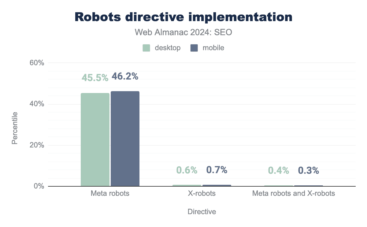 Either implementation method is valid and can be used in tandem. The meta tag implementation is the most widely adopted, representing 45.5% of desktop and 46.2% of mobile pages. The X-robots HTTP header is applied to fewer than 1% of pages. A small number of sites used both tags in tandem. They represented 0.4% of desktop pages and 0.3% of mobile pages.