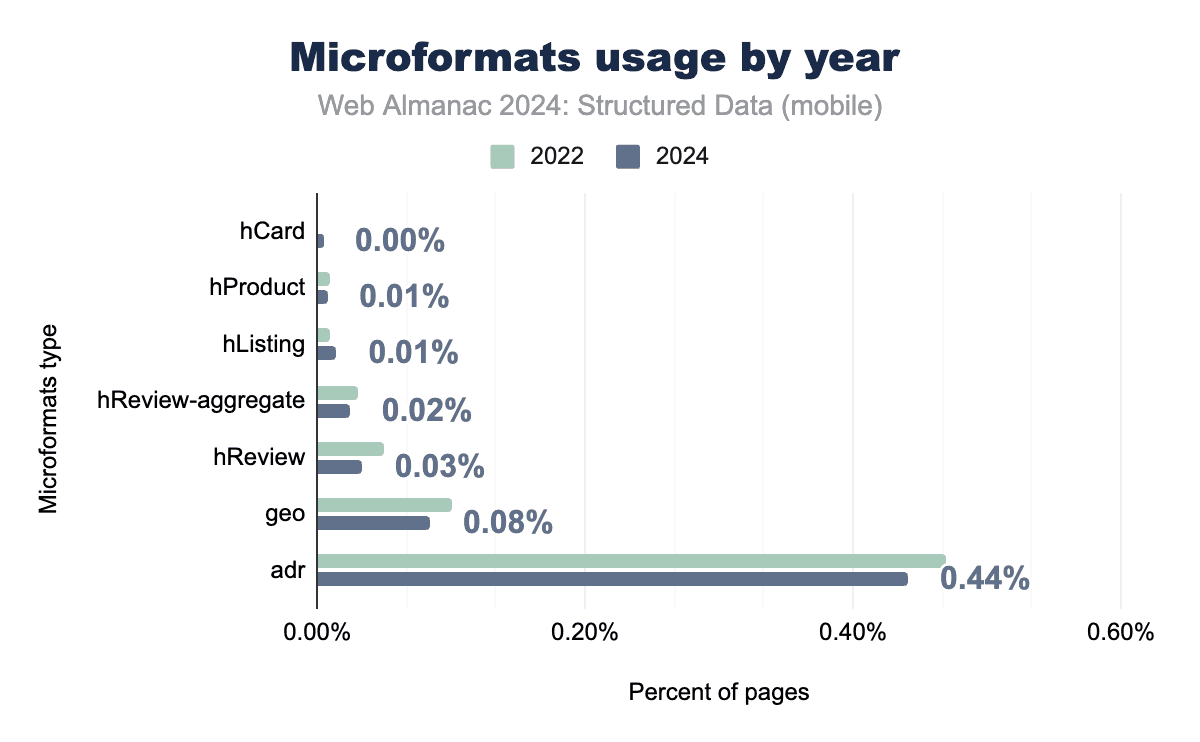 Microformats continue to show limited adoption, primarily in niche use cases where simple, semantic data is required. The adr tag, used for address-related data, remains the most widely adopted Microformats type, appearing on approximately 0.4% of pages across both mobile and desktop platforms. Other tags, such as geo and hReview, have minimal usage, as more sophisticated formats like JSON-LD and Open Graph have become more prevalent.