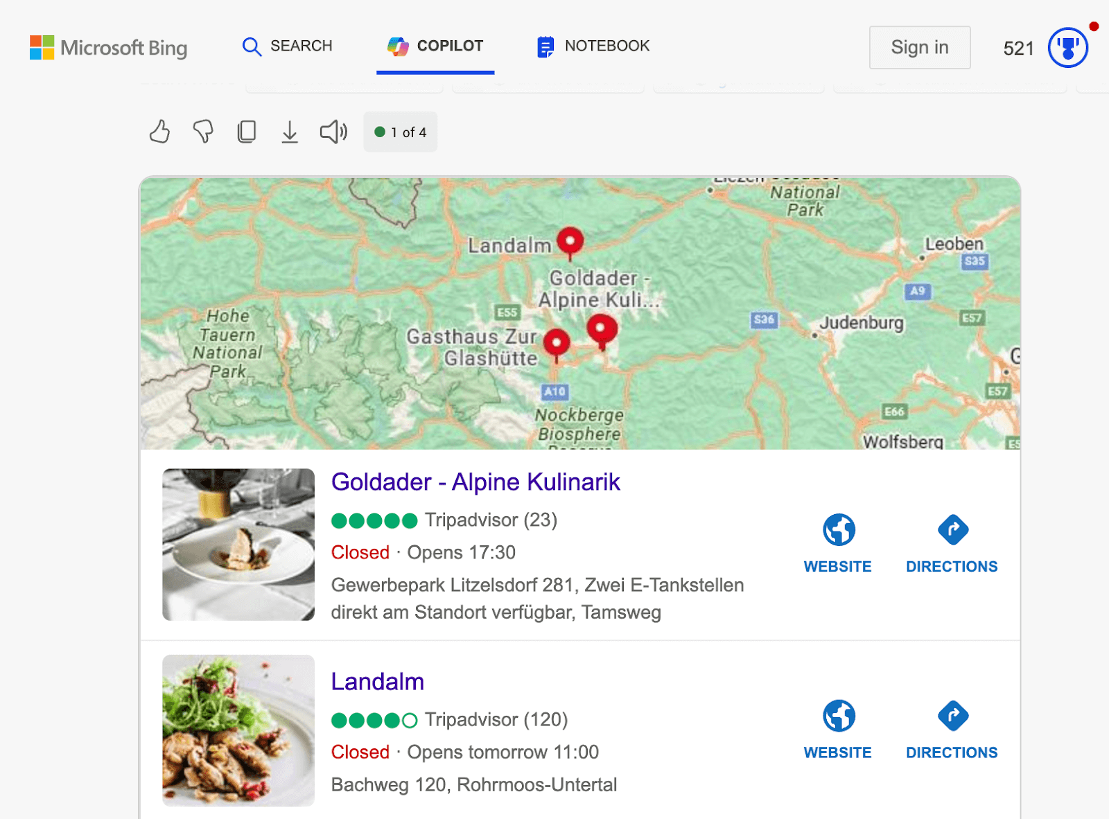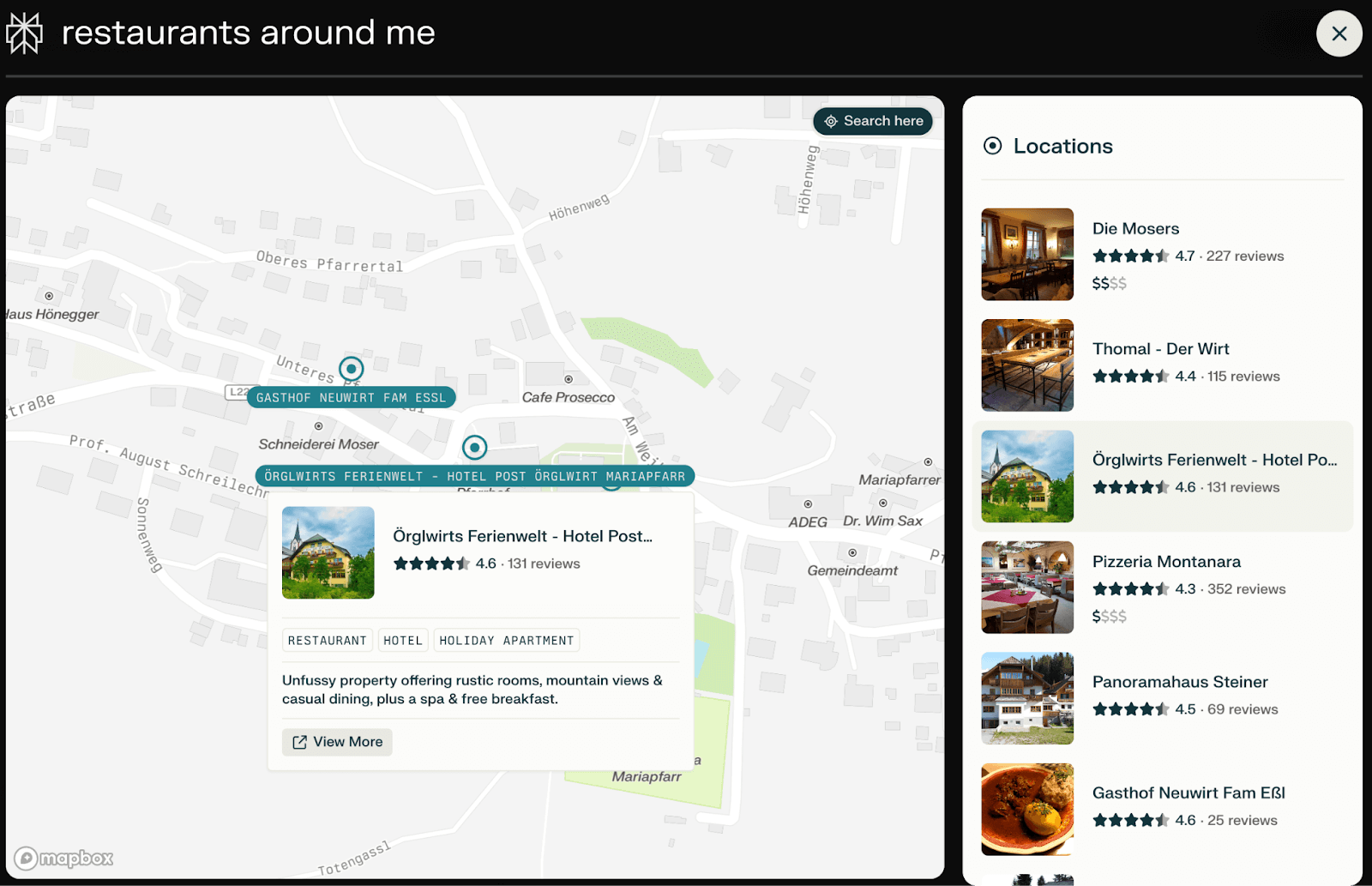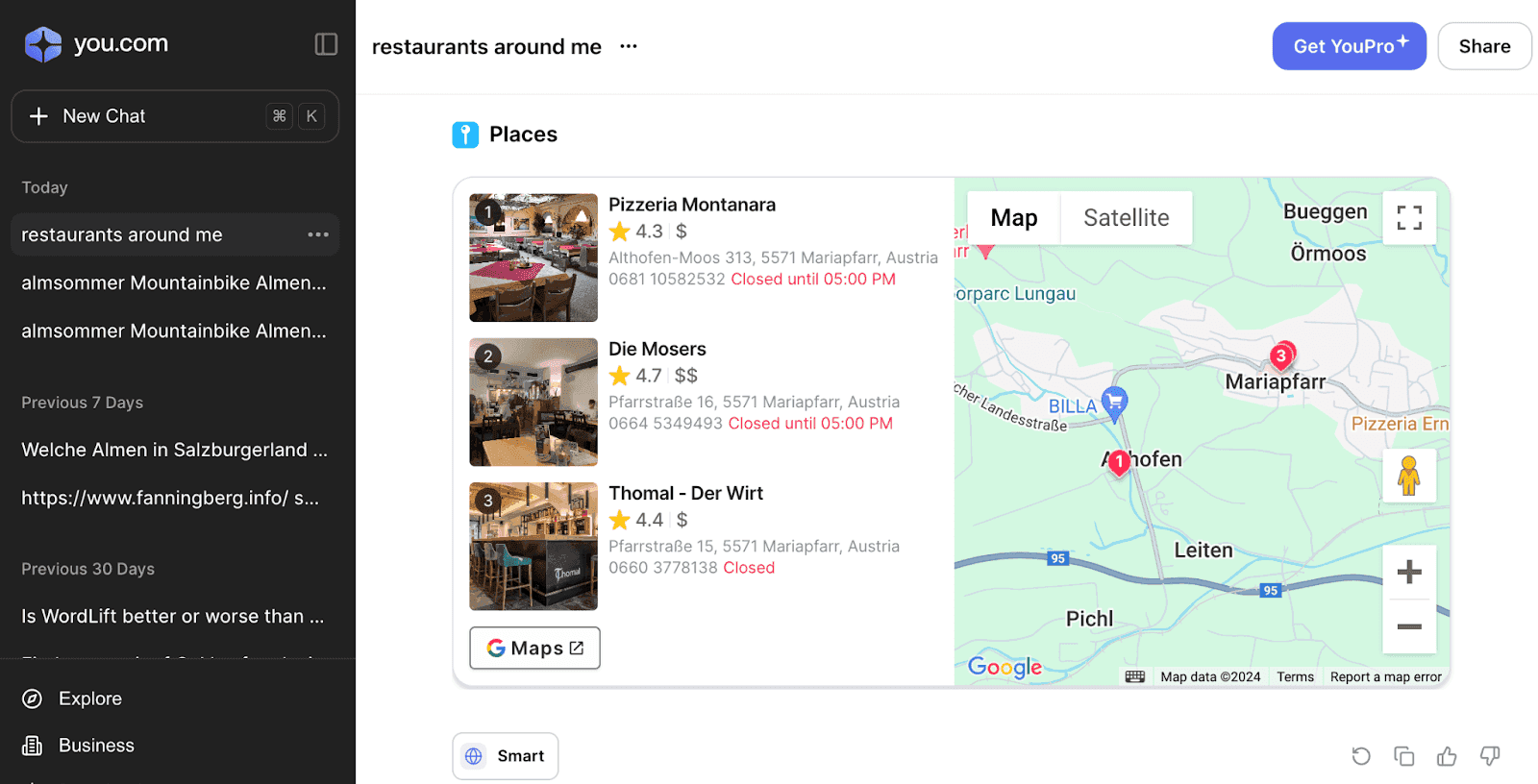 Figure 3.2. Search results in You.com with a map and restaurant listings.