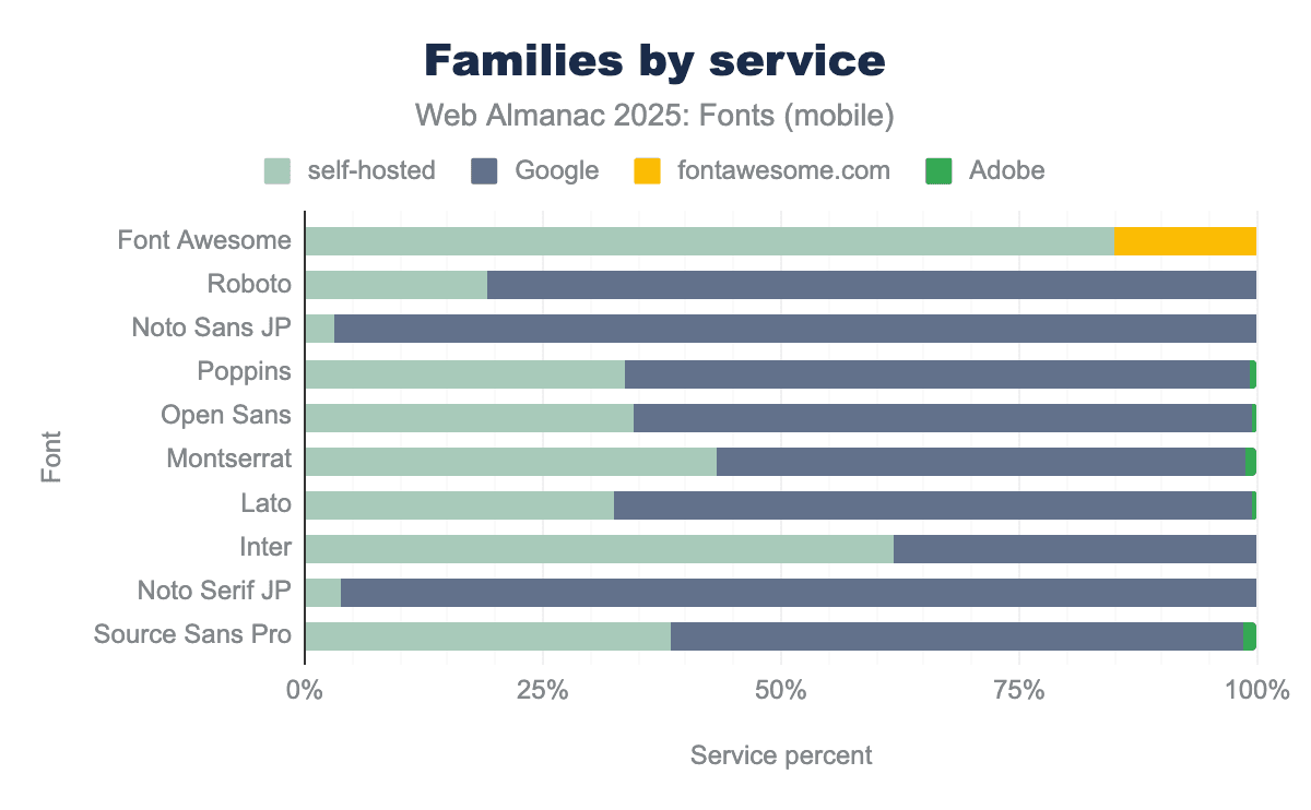 It’s interesting to note which of these fonts tend to be self-hosted versus served from Google. For example, Noto Sans JP (a large Japanese font) is almost entirely served by Google’s CDN in our data. The self-hosted share of Noto Sans JP was only about 0.2% of requests, meaning nearly everyone who uses that font chooses to let Google handle the delivery (likely because it’s a very large file, and Google’s infrastructure is optimized for it). Noto Serif JP is similar: it appears around 1.3-1.4% of requests (mostly Google-hosted). In contrast, many popular Latin-script families have sizable self-hosted footprints in addition to their Google-served usage. We see Roboto being self-hosted too (about 2.2% of font requests on desktop are for self-hosted Roboto files, on top of the 9.2% from Google). Similarly, Poppins is ~2.0% self-hosted, Open Sans ~1.7% self-hosted, Montserrat ~1.4%, Lato ~1.0%, and Inter ~0.9% self-hosted (desktop figures). In each of these cases, the same font is also delivered by Google on many sites. Because the most popular Google Fonts (Roboto, Open Sans, Poppins, Montserrat, Lato, Inter) also appear at non-trivial rates in the self-hosted data, and because self-hosting is growing while Google’s share is easing, it’s likely that many projects begin with Google Fonts and later bring the same families in-house for performance or privacy reasons. (NB: Our data can show the overlap and directional shift, but not the per-site migration path.)