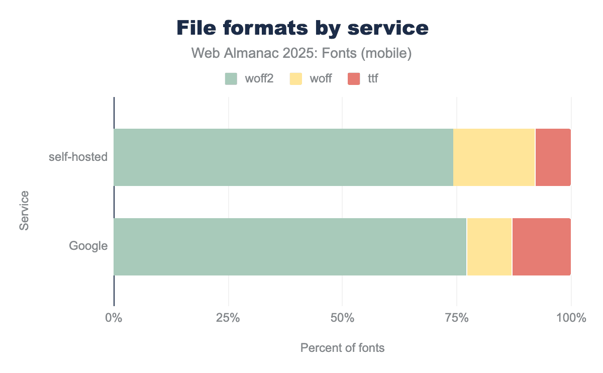 Crucially, if we combine the modern formats, WOFF2 + WOFF together account for over four-fifths of the web font ecosystem. Other formats like OpenType/CFF (.otf) or SVG fonts have effectively vanished from the public web (despite being very much alive on the desktop), and EOT (the old IE-specific format) is practically extinct. Back in 2020, the Web Almanac already noted that SVG and EOT were nearly gone, and that trend has only continued. It’s now rare to encounter a non-WOFF font file in a typical site crawl. The overwhelming advice remains: use WOFF2 for your web fonts, and drop the older formats unless you have a very specific need. This year’s crawl data strongly validates this advice as we see virtually everyone converging on WOFF2, with WOFF as a trailing fallback, while everything else is negligible.