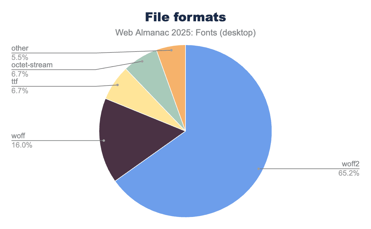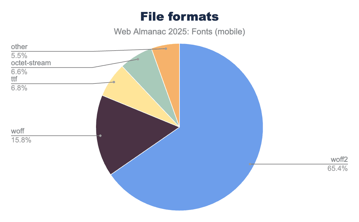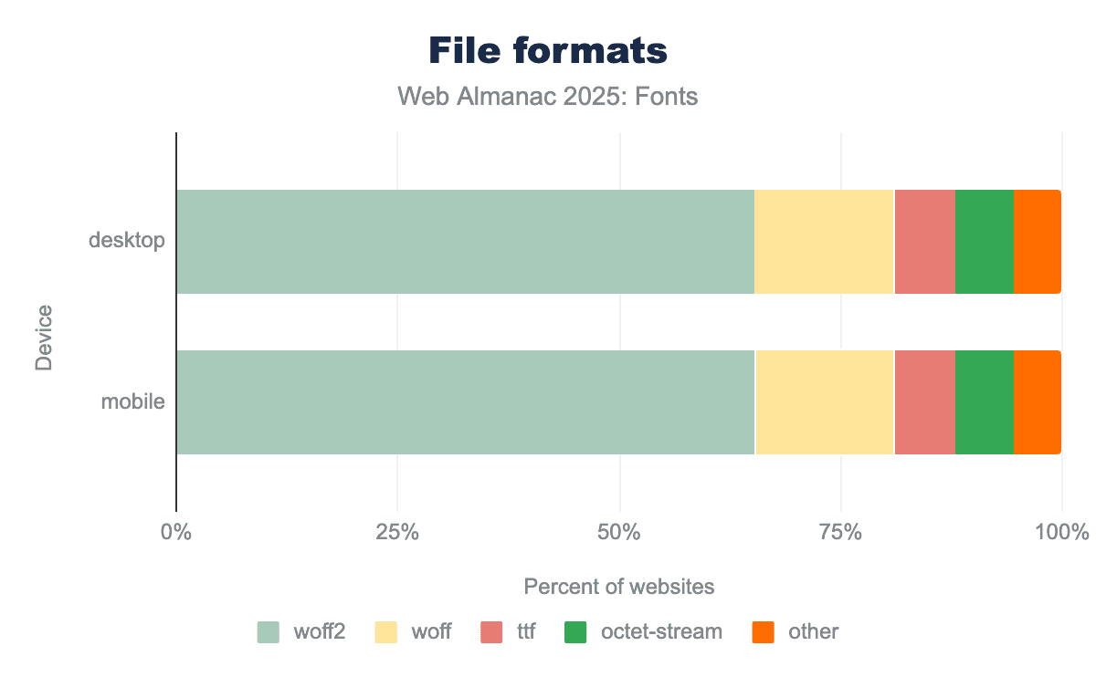 When it comes to font file formats on the web, the modern WOFF2 format continues to lead the way. WOFF2 (Web Open Font Format 2) offers superior compression, resulting in smaller file sizes for faster transfer, and it’s been supported by all major browsers for years now. In 2025, WOFF2 accounts for about 65% of font file requests on both desktop and mobile pages. This is an overwhelming majority of modern font formats, and represents the continued consolidation around WOFF2 as the web’s standard font format. In other words, about two-thirds of all web fonts in this year’s data are in WOFF2 format. This consolidation around WOFF2 is a positive trend for performance, as the better compression leads to faster font loads and less bandwidth usage.