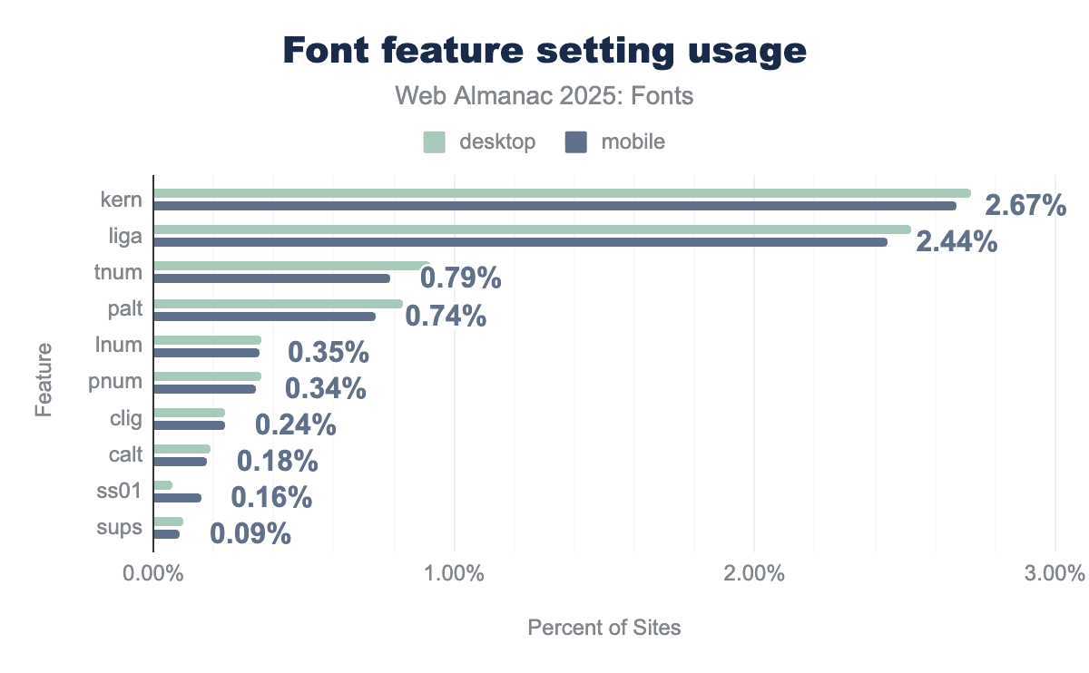 The usage of low-level font-feature-settings is relatively small in absolute terms. Only about 2-3% of pages manually set specific OpenType features through this property. The most commonly toggled features in CSS are kern and liga—likely because some CSS resets or frameworks ensure kerning is on or ligatures are on/off deliberately. In 2025, font-feature-settings: kern appears on roughly 2.7% of desktop pages, and liga on about 2.5%. After that, there’s a drop: tnum (tabular numbers) on ~0.8-0.9%, palt (proportional alternate width, used for some CJK spacing tweaks) on ~0.7-0.8%, and then things like lnum (lining nums) or pnum on ~0.4%. Stylistic sets (like ss01) or discretionary ligatures appear on only ~0.1% or less of pages via direct settings.