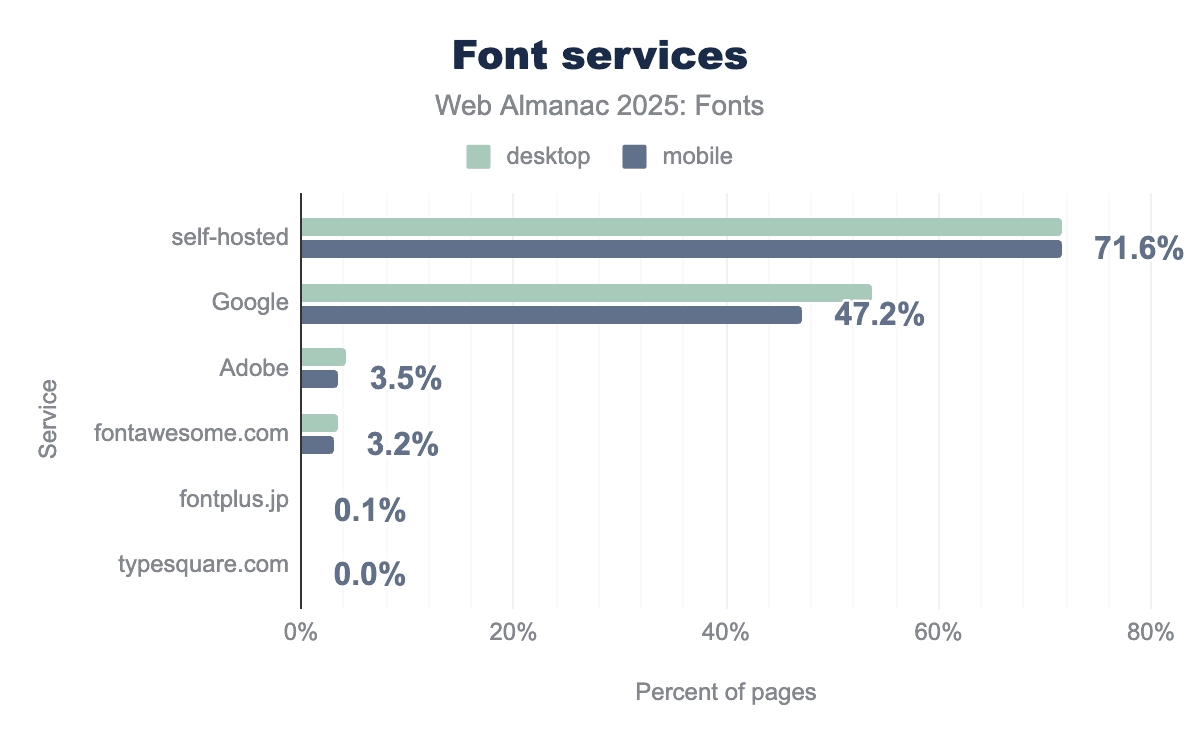 • Mixed hosting (self-hosting + a service): Another 36.1% of desktop sites and 31.7% of mobile sites use a combination of self-hosted fonts and a font service on the same page. In most of these cases the service is Google Fonts, with perhaps an icon CDN or another source added in. This “hybrid” approach was slightly more common last year (around 38.5% of desktop and 32.7% of mobile pages in 2024), so it has dipped a bit as some sites fully switch over to self-hosting.