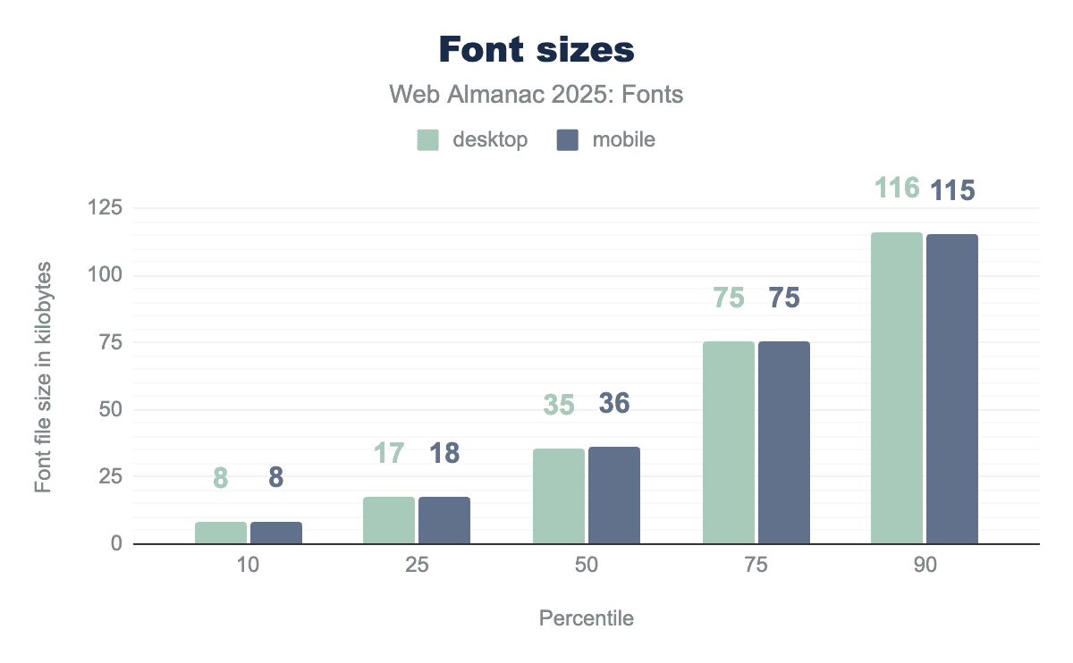 • The tail end of the distribution is very heavy: at the 99th percentile, desktop font files in 2024 were around 776 KB (and 572 KB on mobile). In 2025, the largest 1% of fonts we see are still in the hundreds of kilobytes. These are likely massive CJK fonts, icon fonts with embedded graphics, or fonts accidentally served with debug tables. It’s a reminder that while most fonts are reasonably sized, a few outliers can be extremely heavy.