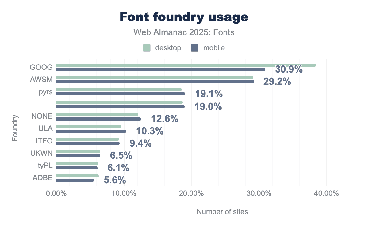 Even with the growth of self-hosting, hosted font CDNs still appear on roughly half of all websites, primarily because of Google’s massive footprint. This year’s crawl found Google Fonts on about 54% of desktop sites and 47% of mobile sites. (This counts any site that uses Google’s API to fetch fonts, whether Google is the only source or used alongside others.) Google’s reach on desktop dropped about 3 percentage points from 57% in 2024, and is down about 6 points from 2022, reflecting the shift toward self-hosting. On mobile, Google’s share dipped only slightly (about 0.3 points since last year, and about 4 points since 2022). The overall pattern is the same as noted in 2024: Google Fonts is still the default choice for many, but its dominance is slowly diminishing as more sites self-host.