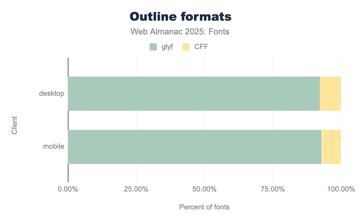 This year, about 92-93% of fonts loaded on the web were using TrueType outlines (the traditional quadratic Bézier “glyf” table). This is up slightly from about 90% in 2022. In contrast, PostScript/CFF outlines (the cubic Bézier outlines often found in .otf fonts) have declined to around 7% of web fonts (down from ~9-10% a few years ago). Modern web font services and foundries often provide TTF/WOFF2 even for fonts originally designed as PostScript outlines, because TrueType can have performance or size advantages for certain use cases (especially when not hinting with bytecode).