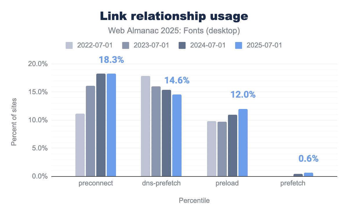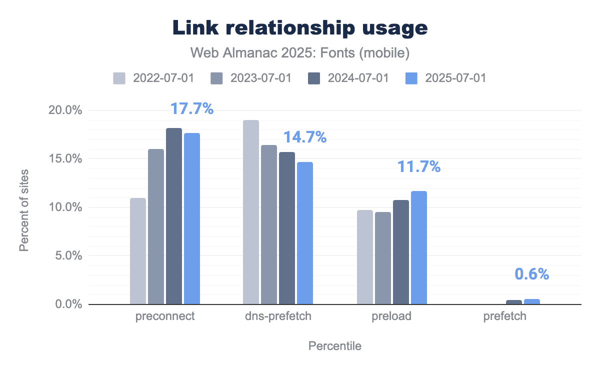 Meanwhile, dns-prefetch (a lighter hint that only resolves DNS) has been trending downward. In 2025, we found about 14.6% of desktop pages using dns-prefetch for fonts, down from ~17.9% in 2022. Mobile is similar at 14.7%. This decline makes sense: once developers discover preconnect (which includes DNS resolution as part of establishing the connection), the separate dns-prefetch becomes less necessary. Many sites that previously used dns-prefetch have upgraded to using preconnect, which provides a more substantial optimization by also doing the TLS handshake early.