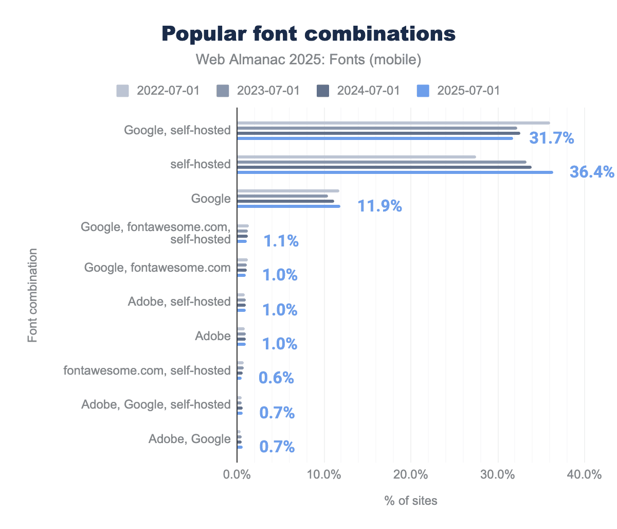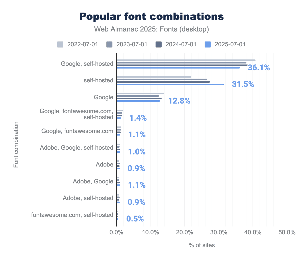 At the same time, font delivery methods have been shifting. An increasing number of sites are choosing to self-host their font files rather than relying exclusively on third-party CDNs, and many use a mix of both approaches. Last year’s data showed a clear rise in exclusive self-hosting alongside a decline in sites that combined self-hosting with external services, and we investigate whether this trend continues in 2025.