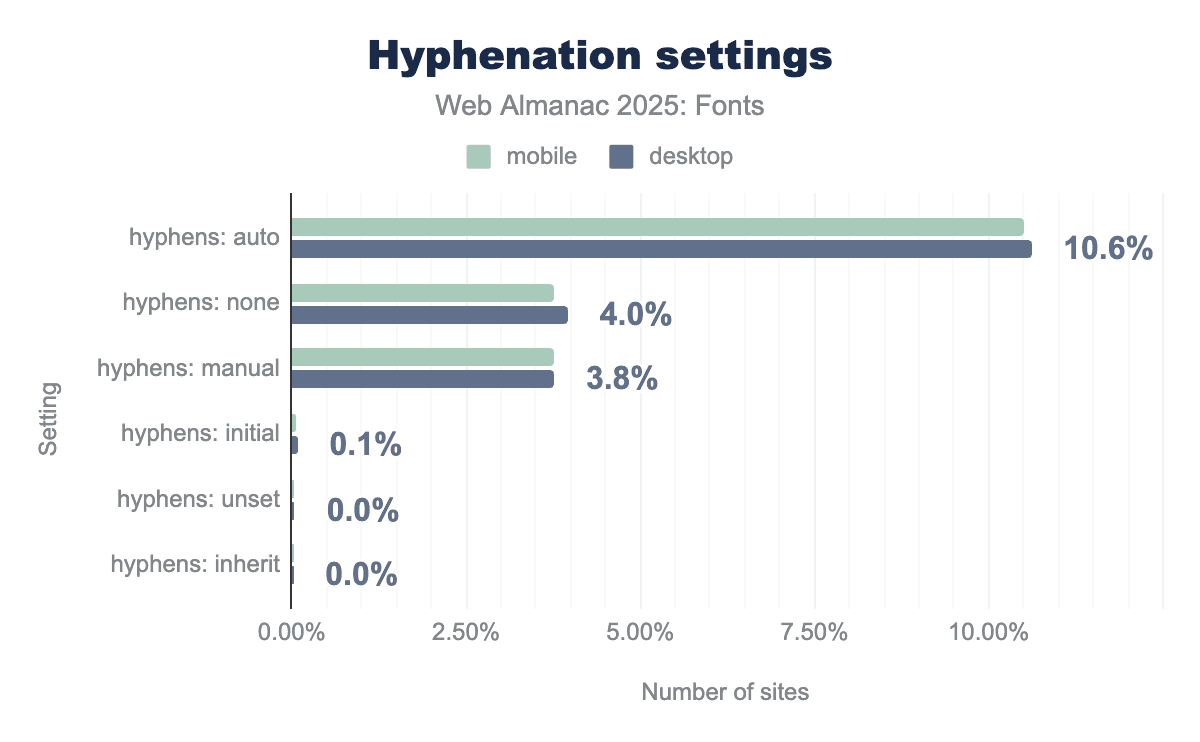 On the other hand, about 3.8-4.0% of pages have hyphens: none or hyphens: manual set (often by resets or frameworks). This is usually done to ensure no automatic hyphenation (for example, some designers prefer to avoid hyphens in titles or certain components, or older CSS resets set hyphens: none to avoid any unexpected breaks).