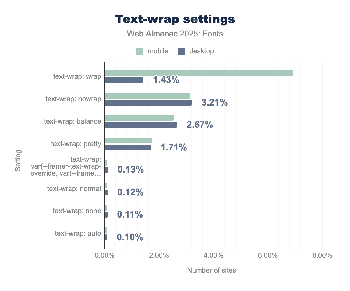 The text-wrap: pretty property (which allows a bit of looseness in spacing to avoid very short words and other funny placements) is on about 1.7% of pages (both desktop and mobile). This is slightly lower than the balance property. Pretty is more for paragraphs, to avoid harsh breaks, and might be used selectively where full justification or certain line-breaking issues occur.